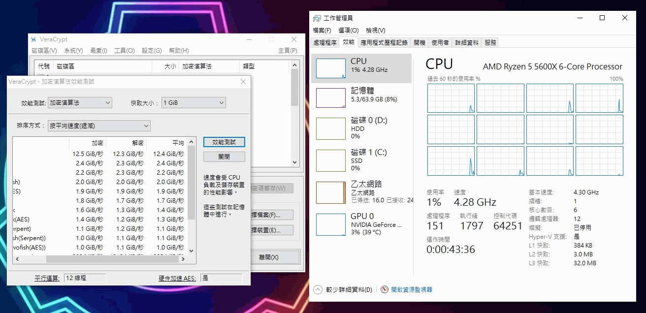 以下為 CPU 抽樣之 「AES 加解密」效能測試,使用 VeraCrypt (硬碟加密軟體),提供之「性能測試工具」當測試基準。